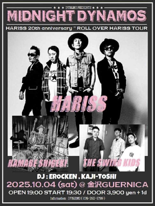 ◆ 10/2/20252025/10/4 (Sat) 金沢GUERNICA ![]() HARISS 20th anniversary 「ROLL OVER HARISS」 2025年10月4日 (土) 金沢GUERNICA DYNAMO PRESENTS MIDNIGHT DYNAMOS OPEN 19:00 START 19:30 / DOOR 3900Yen (+1D) 出演 HARISS / HAMABE SHIGEKI / THE SWING KIDS DJ : EROCKEN / KAJI-TOSHI INFO : DYNAMO : 076-262-5799 |